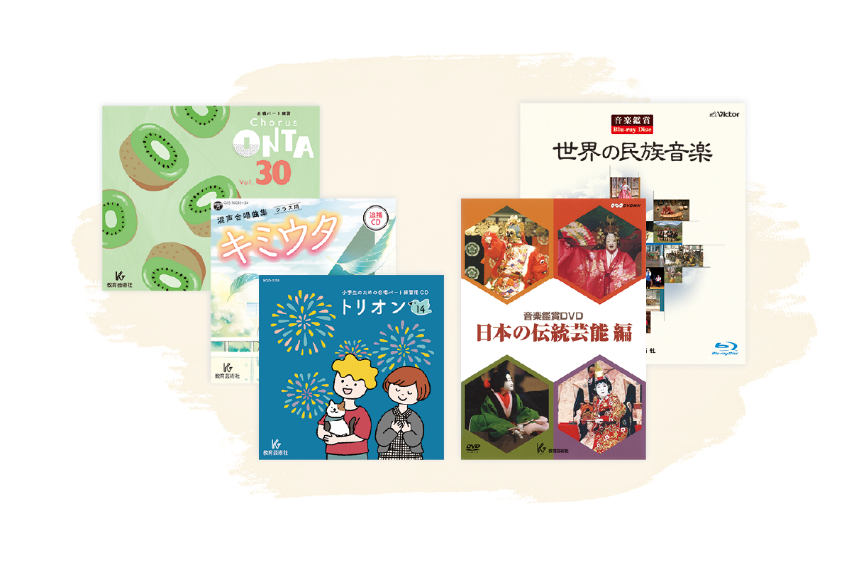 当社発行の楽譜に準拠したCDや、学習をサポートする映像資料など、多彩な視聴覚教材を展開しています。1993年から発売されている合唱パート練習用CD「ChorusONTA®」シリーズは、混声合唱曲のパート別の歌とカラピアノを収録しており、学校の授業や音楽会、コンクールなどのさまざまな合唱活動で活用されています。2015年からは小学生のための合唱パート練習用CD「トリオン」シリーズも発売されています。