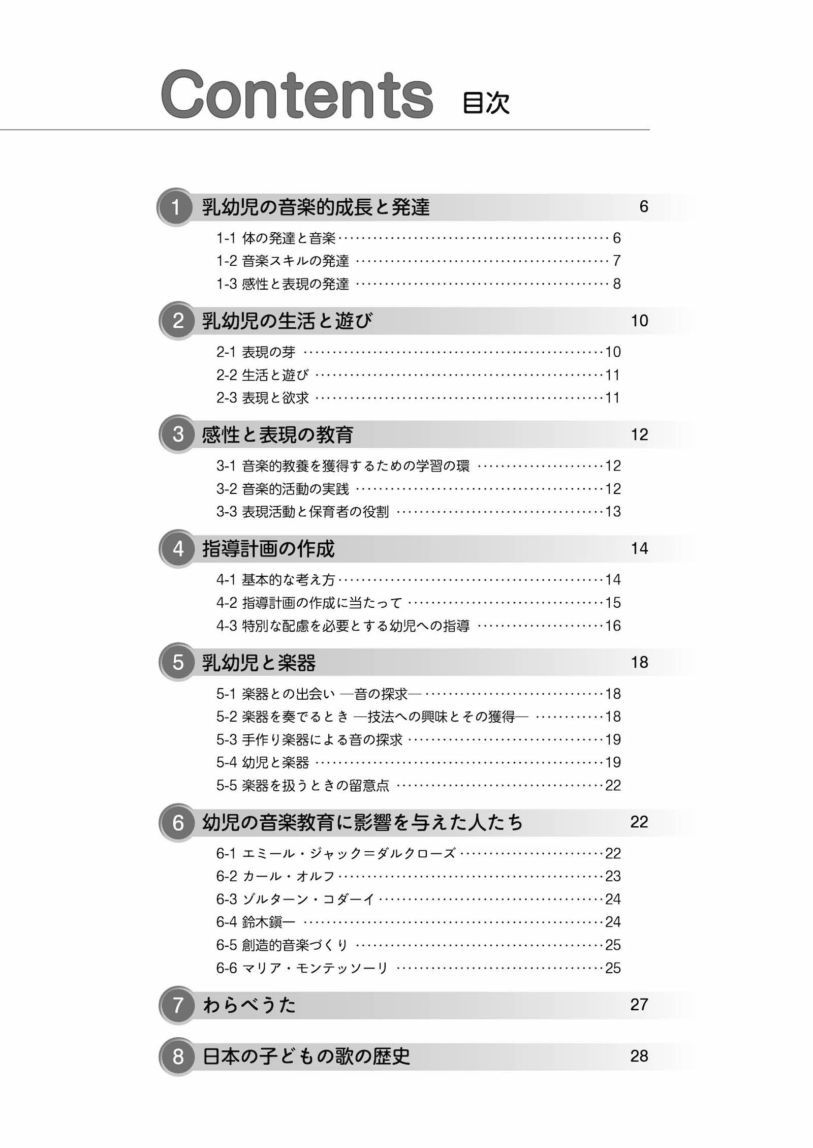 ○幼児教育の理論、指導計画作成のためのチェックリスト、楽器の奏法の紹介(手作り楽器を含む)、音楽メソッドの紹介に加え、各セクションの終わりには《討論のための課題》を用意している。