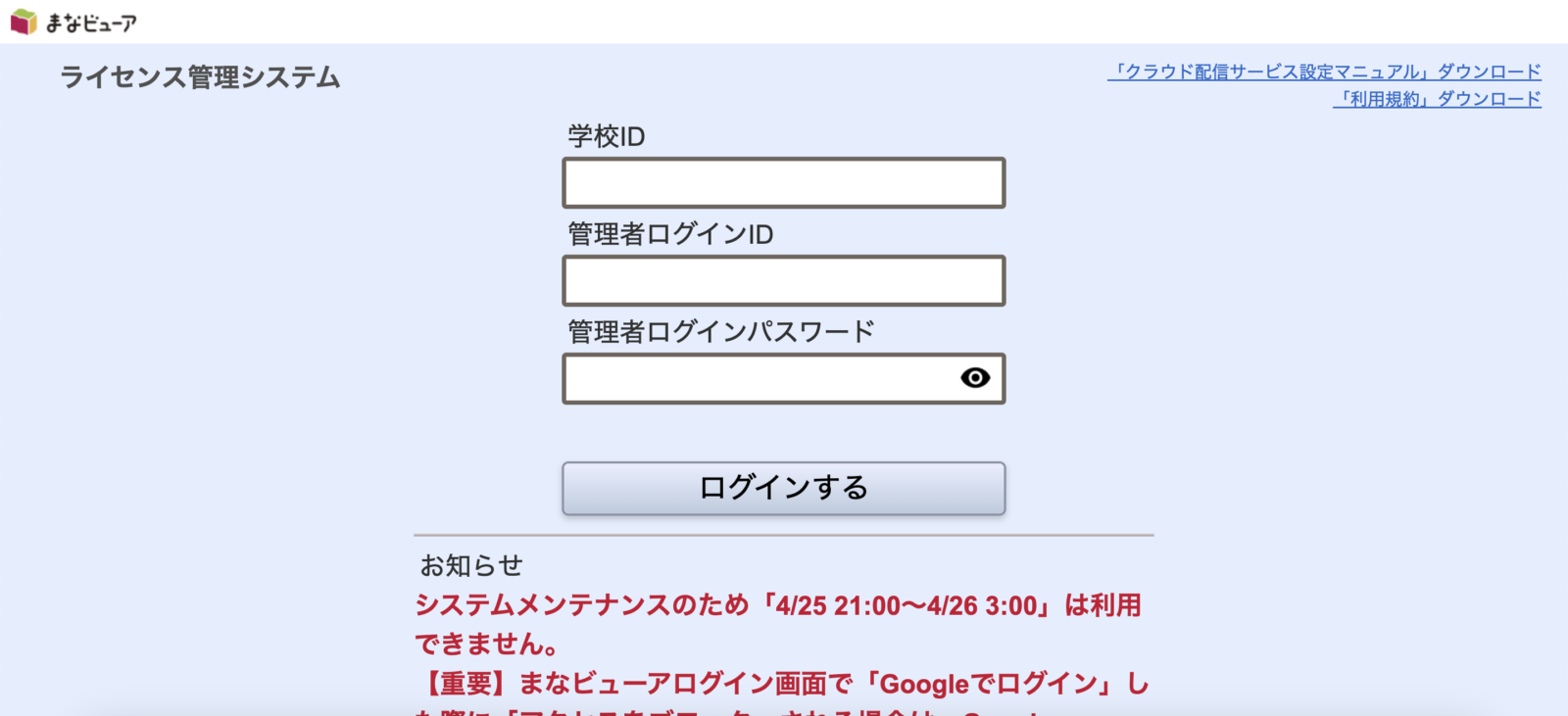 学校ID、管理者ログインID、管理者ログインパスワードは、「まなビューア」で共通です。