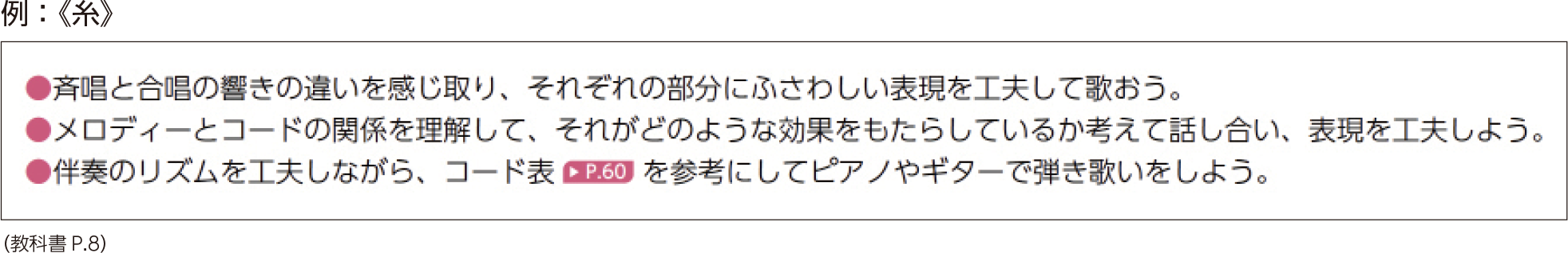 各パートの掛け合いのおもしろさやハーモニーの美しさ、曲想の変化を味わいながら歌唱表現を深めることのできる楽曲です。