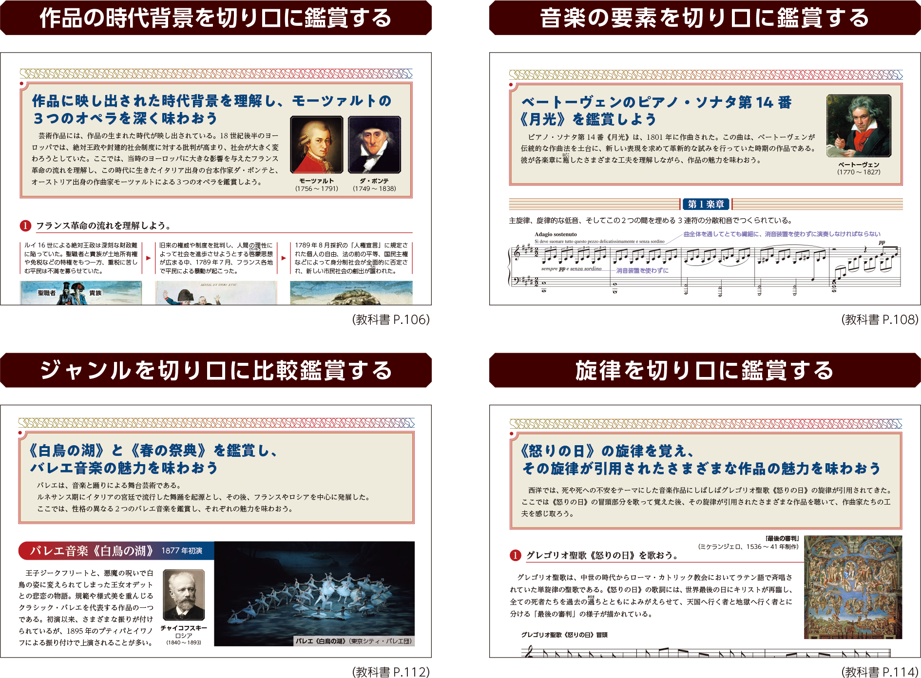 授業の流れの例や、指導のヒントなど、授業を多角的にサポートする資料を充実させています。各教材の詳しい解説はもちろん、西洋音楽史や日本音楽史の基礎知識の確認に最適な資料も収録しています。