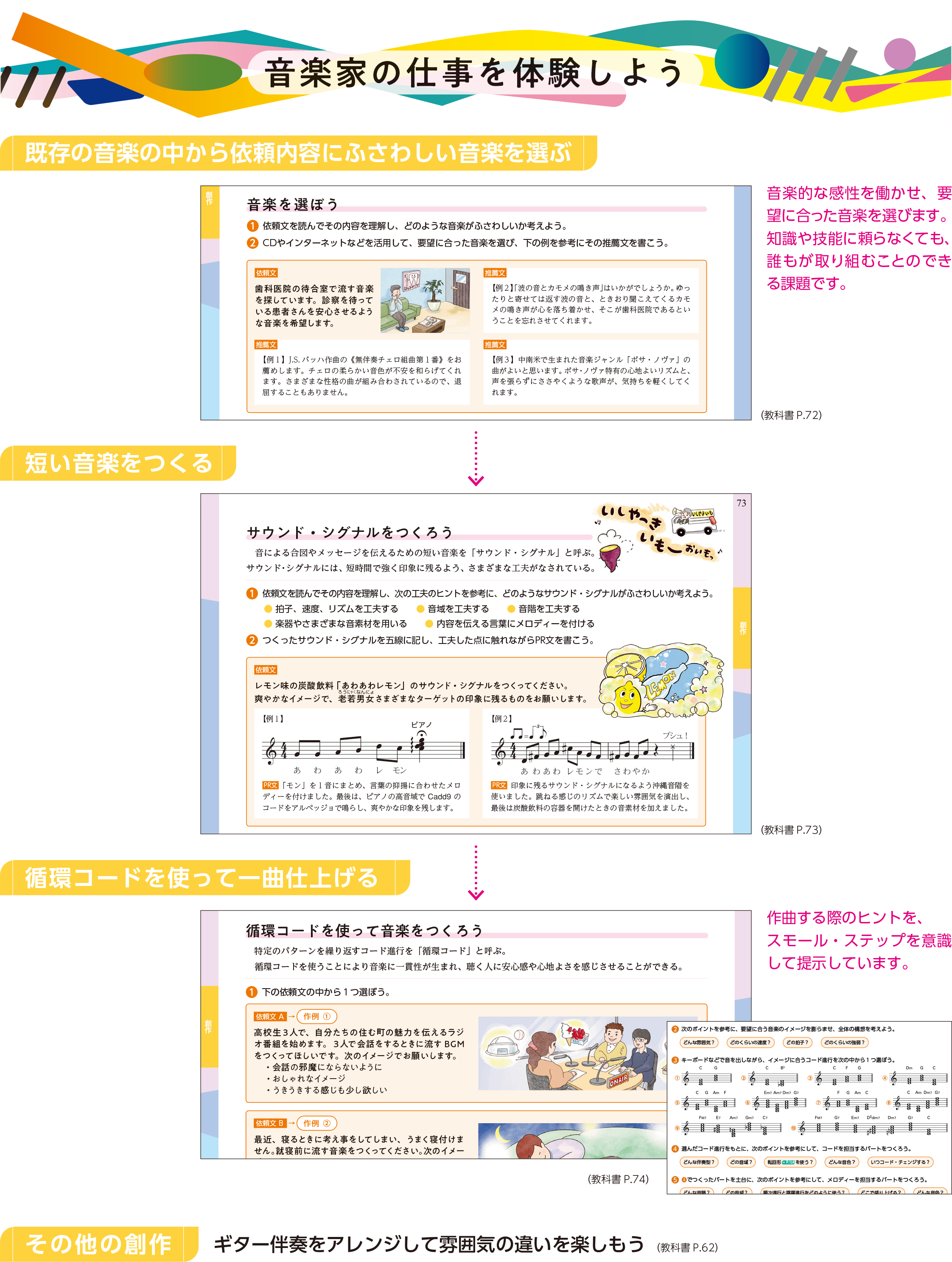 依頼文をもとに、音楽家になったつもりで創作に取り組む課題を掲載しました。知識や技能を必要としない課題から始めるので、スモール・ステップで学習を進めることができます。