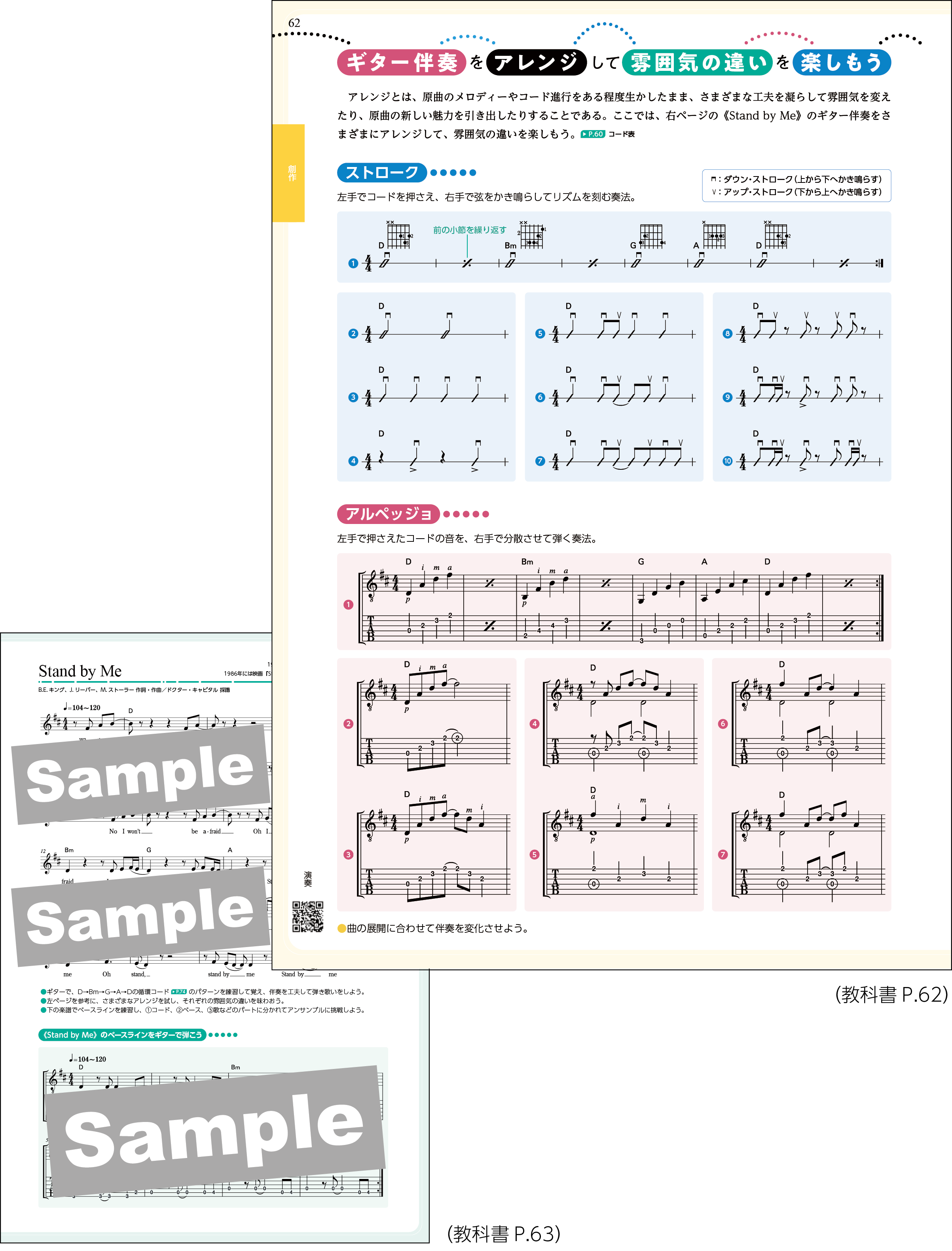ギター教材《Stand by Me》の学習と合わせて、ストローク奏法とアルペッジョ奏法を習得しながら、コードを用いた伴奏づくりに取り組みます。