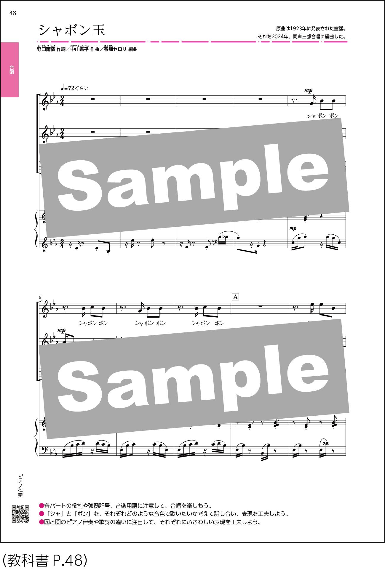 この教科書のために書き下ろした、同声三部合唱曲《シャボン玉》を掲載。