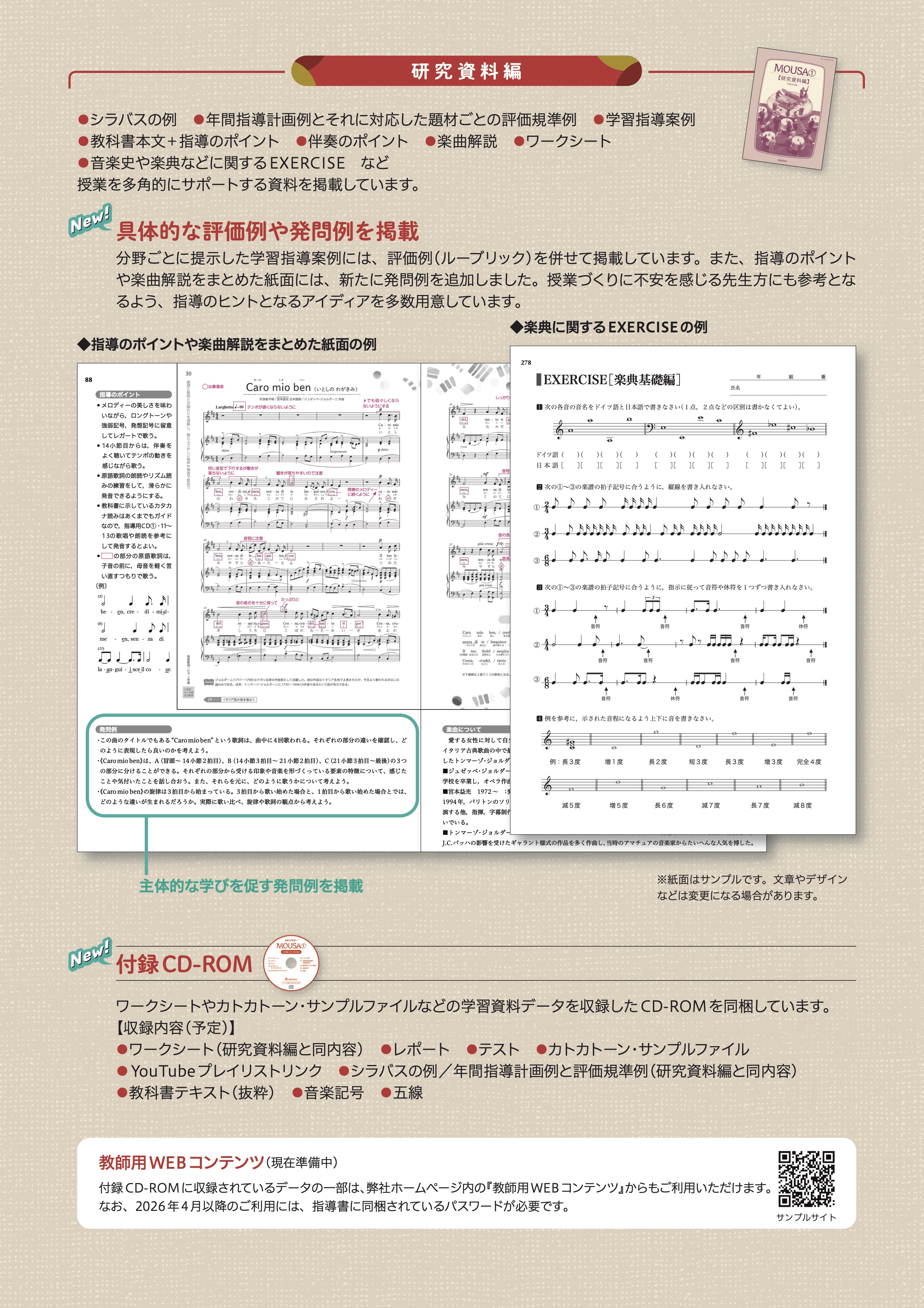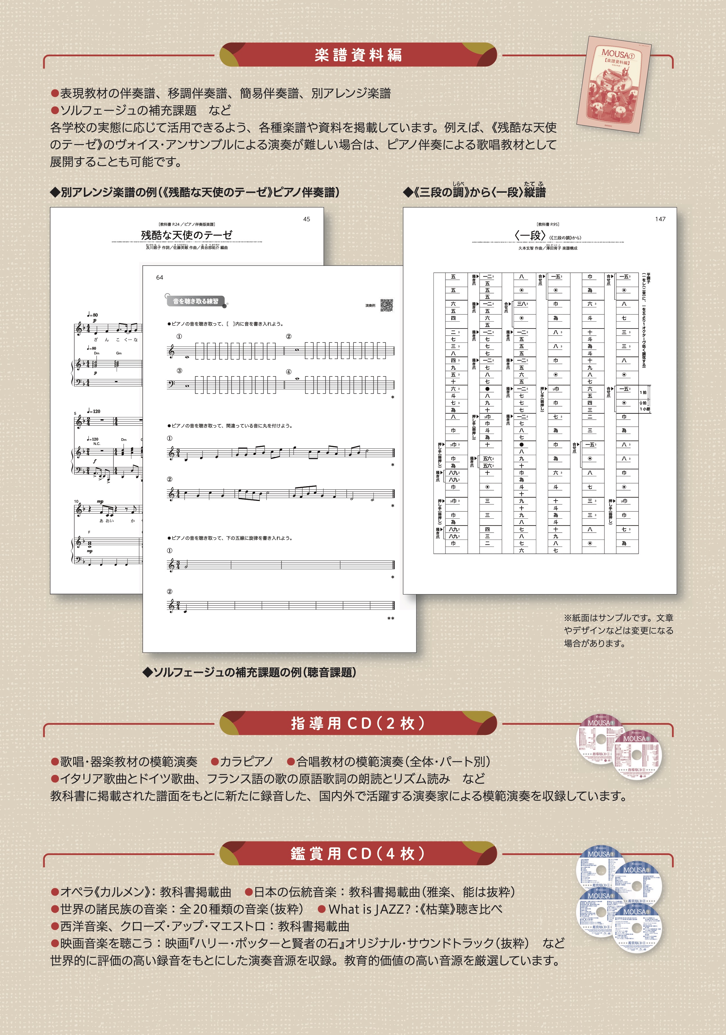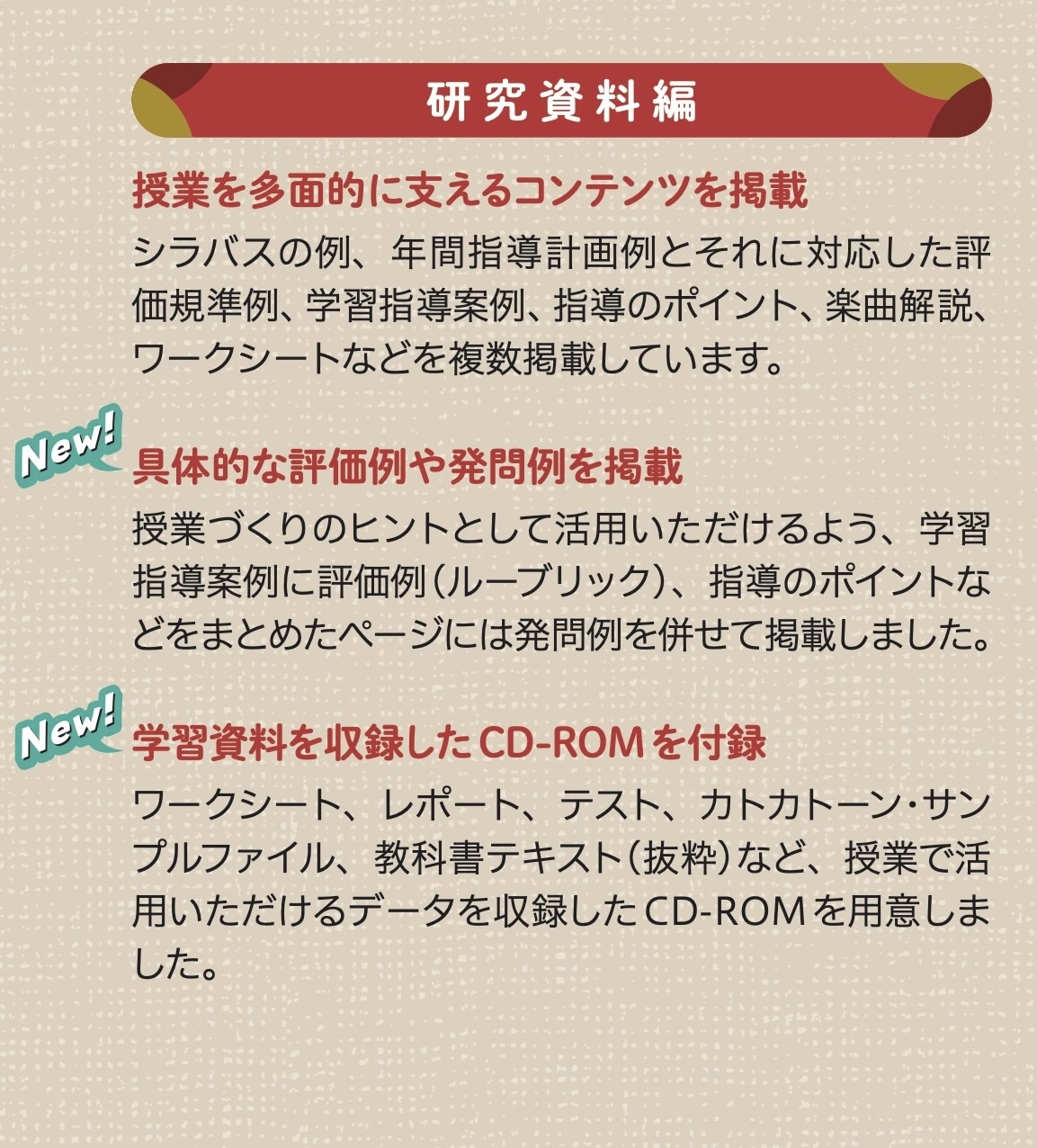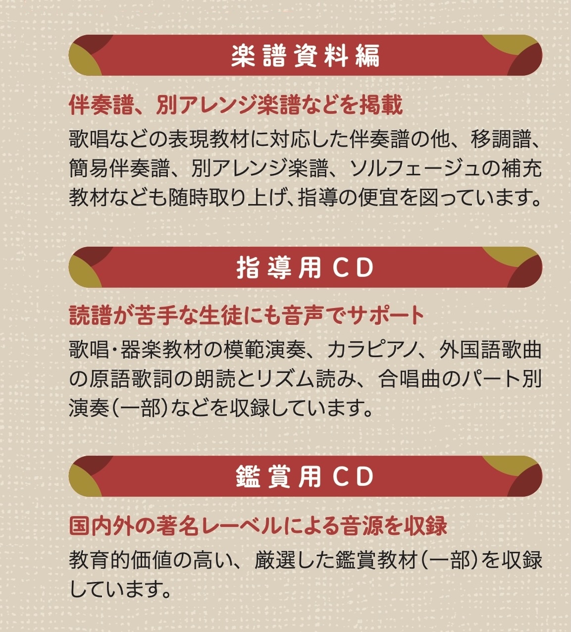 特徴|改訂のポイント|掲載曲一覧|試聴|二次元コードコンテンツ|歌唱・器楽・創作・鑑賞・資料|指導書|検討の観点別に見た特色|鑑賞参考教材|内容解説資料|年間指導計画例と観点別評価規準例|教師用 WEBコンテンツ|シラバスの例