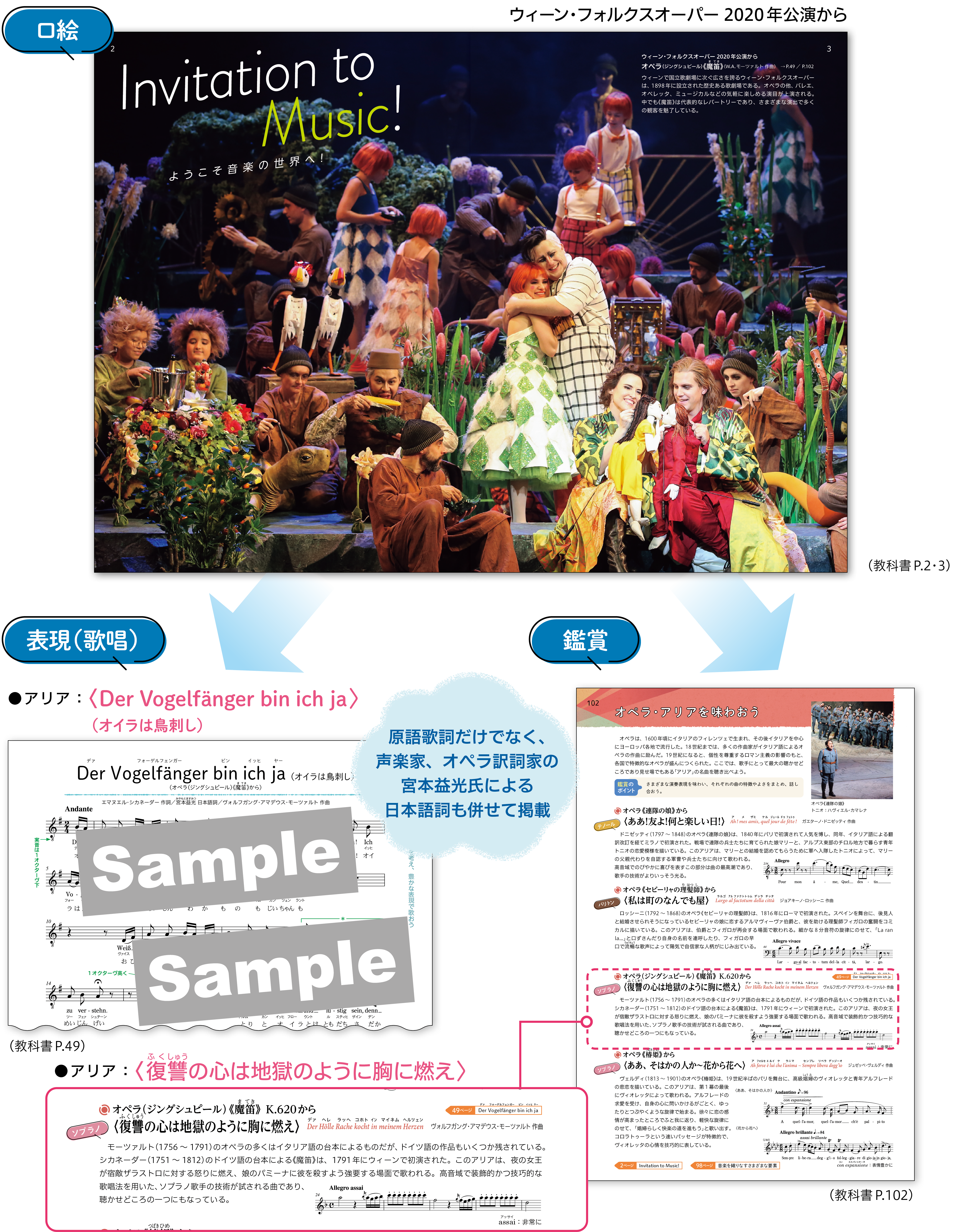 また、歌唱・鑑賞教材のそれぞれにアリアを厳選し、鑑賞の学習を通して理解したことをアリアの歌唱に生かすことで、より豊かな表現へとつなげます。