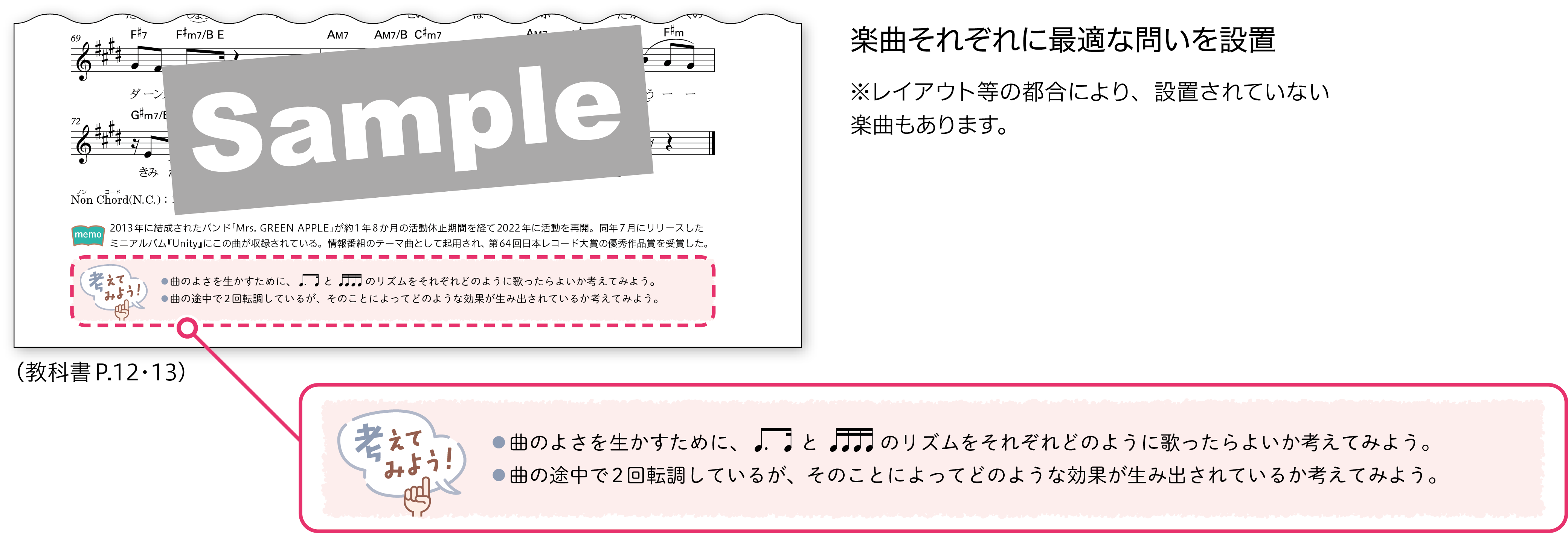 生徒が楽譜に興味をもち、音楽について主体的に考えるきっかけとして、それぞれの楽曲の特徴について、音楽を形づくっている要素などに着目して考えることのできる問いを用意しました。