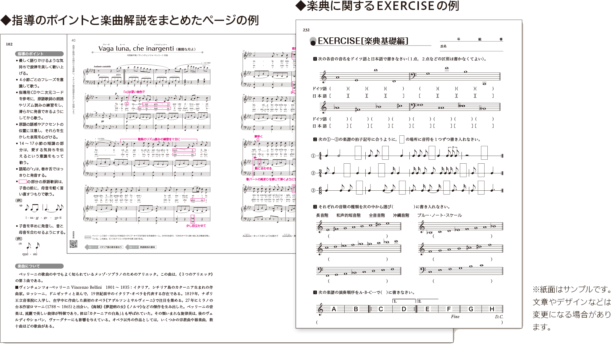 表現教材に対応した伴奏譜の他、移調譜、簡易伴奏譜、別アレンジ楽譜、ソルフェージュの補充教材なども取り上げ、指導の便宜を図っています。