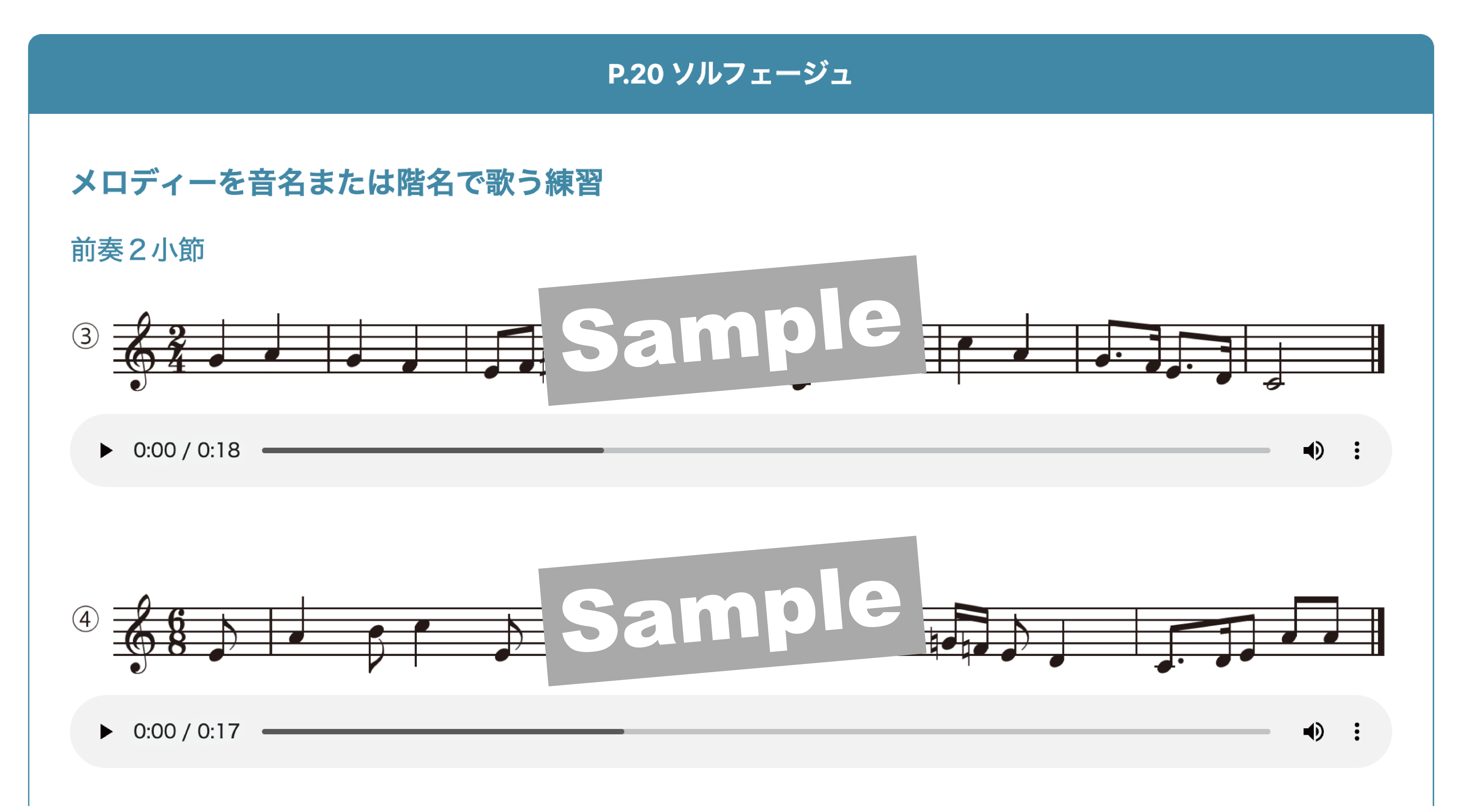 歌唱・器楽教材の範奏、カラピアノ、外国語歌曲の原語歌詞の朗読とリズム読み、合唱曲のパート別音源(一部)などを収録しています。