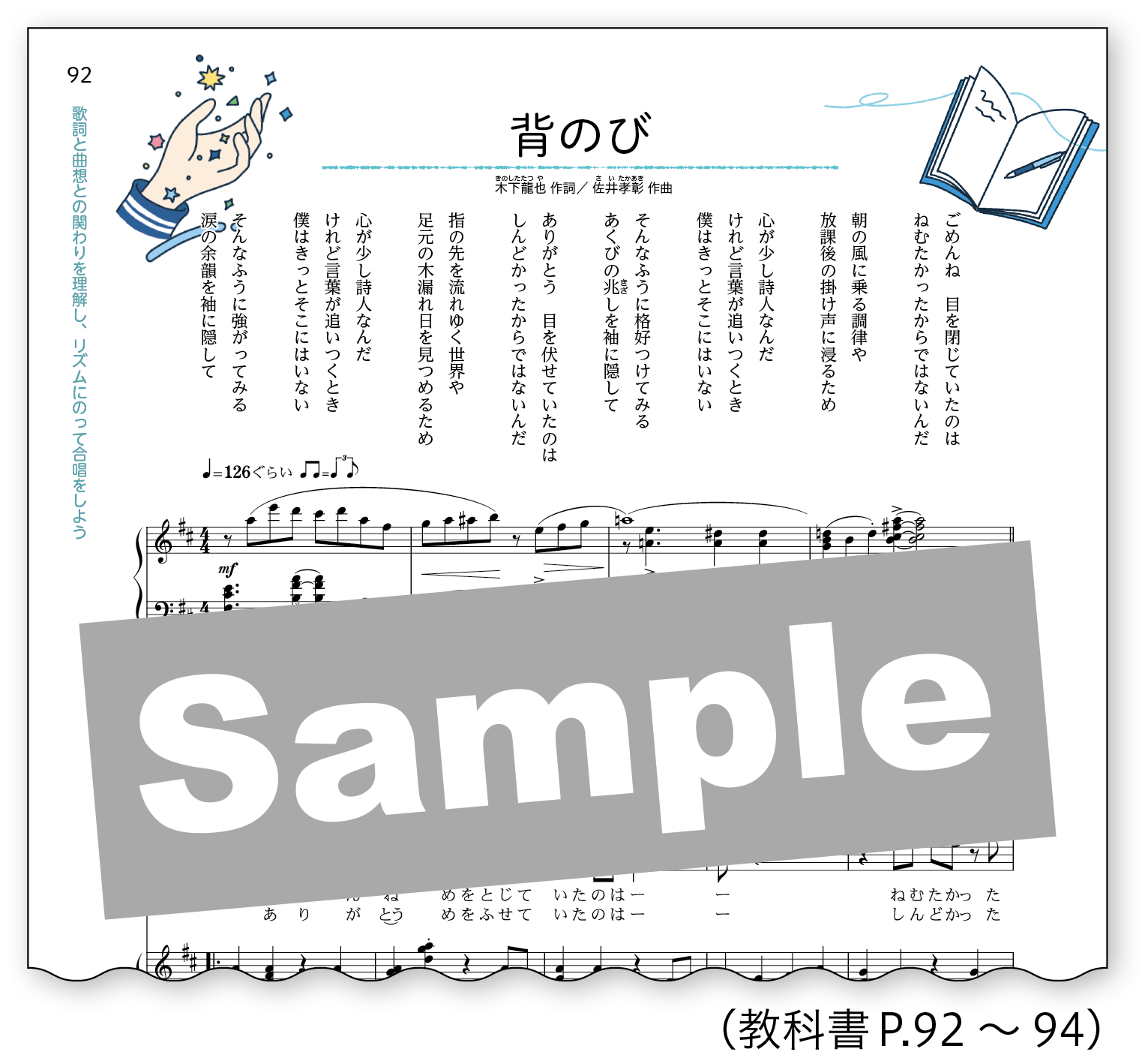 この教科書のために書き下ろされた、歌人の木下龍也氏作詞、佐井孝彰氏作曲による混声三部合唱曲《背のび》を掲載しています。