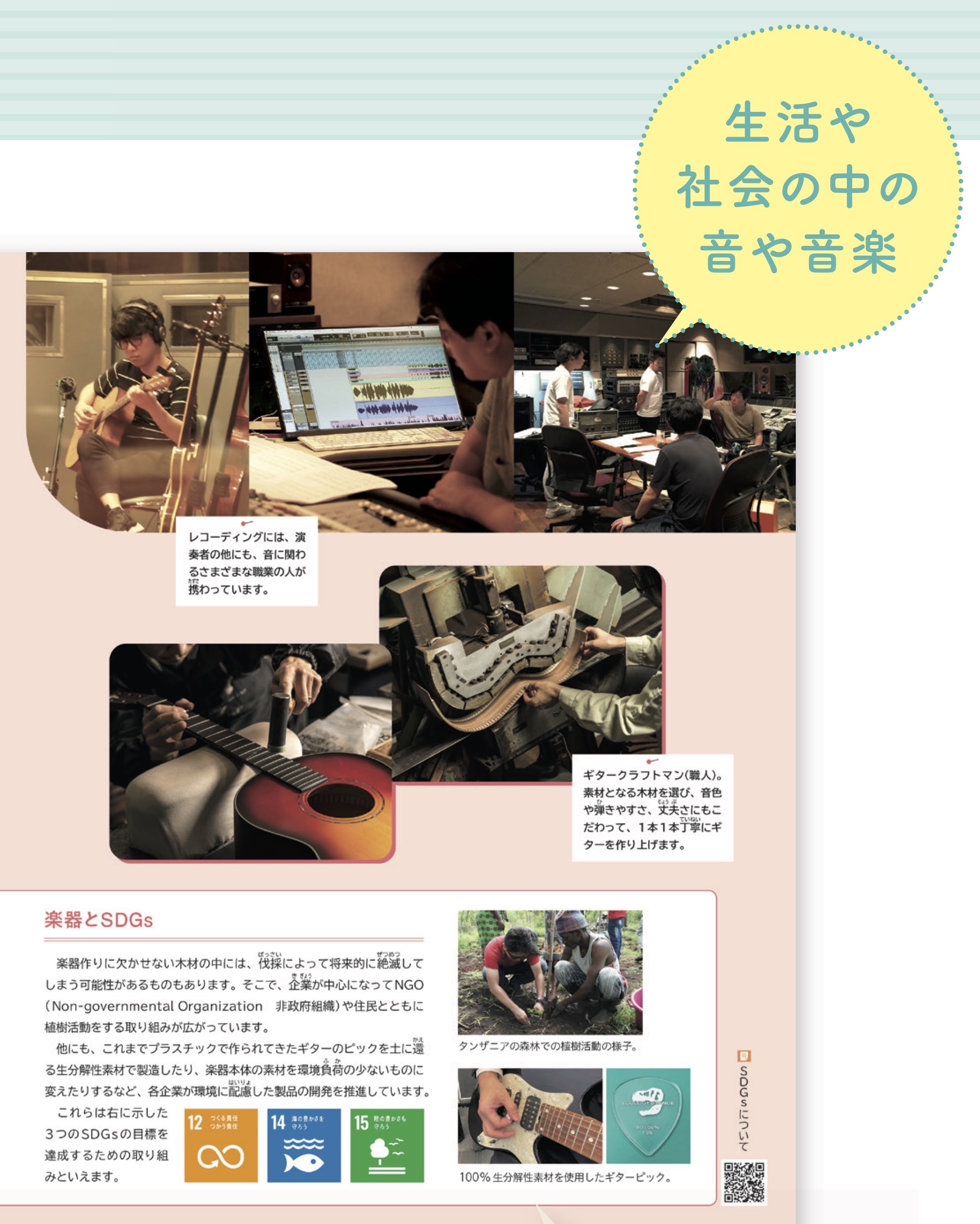 2つ目は、音楽には欠かせない楽器の製造における、森林伐採や海洋ゴミなど昨今の環境問題に対する企業の取り組みについてです。楽器を選ぶ際の指標にしたり、楽器を大切に扱う意識をもったりするきっかけとなるよう期待しています。