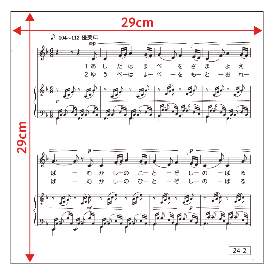 • 1段につき4小節程度の楽譜を2段以上掲載できるように、290mm×290mmの正方形判を採用しました。